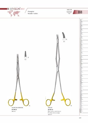 • • B&i ERGUN ® • -- 411'-ft""' , ... / HARD TIPS •l Portegüleı B8 Needle Holders . ,. .. 1 4�-.... 1/ı 0,5 0,5 NAUNTON-MORGAN MÜLLER B8 088.26 B8 089.36 260mm Derin rektum cerrahisi için For deep rectum surgey 360mm 261