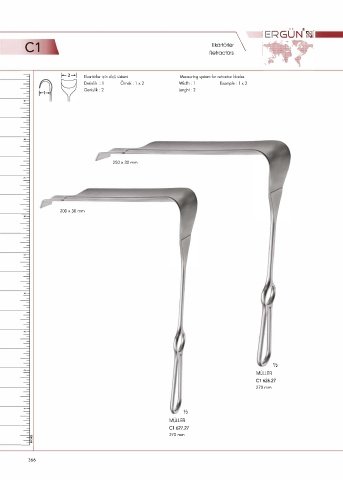 C1 Retractors Ekartörler \ Ekartörler için ölçü sistemi Measuring system for retractor blades Derinlik : l Örnek : 1 x 2 Width : l Example : l x 2 Genişlik: 2 Lenght: 2 250 x 30 mm 200 x 30 mm ½ MÜLLER cı 626.27 270mm ½ MÜLLER C1 627.27 270 mm 366
